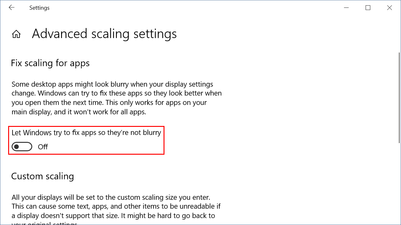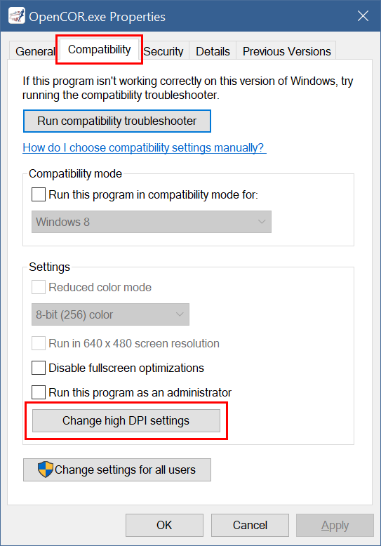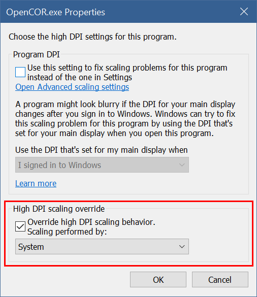 A scaled display will, on Linux, result in some aspects of OpenCOR being rendered at the wrong size (e.g., icons will be smaller and scroll bars bigger). On Windows, OpenCOR should scale itself automatically, although it will look more or less blurry depending on your display scaling and screen resolution. In case OpenCOR does not scale itself, turn off Fix scaling for apps:
