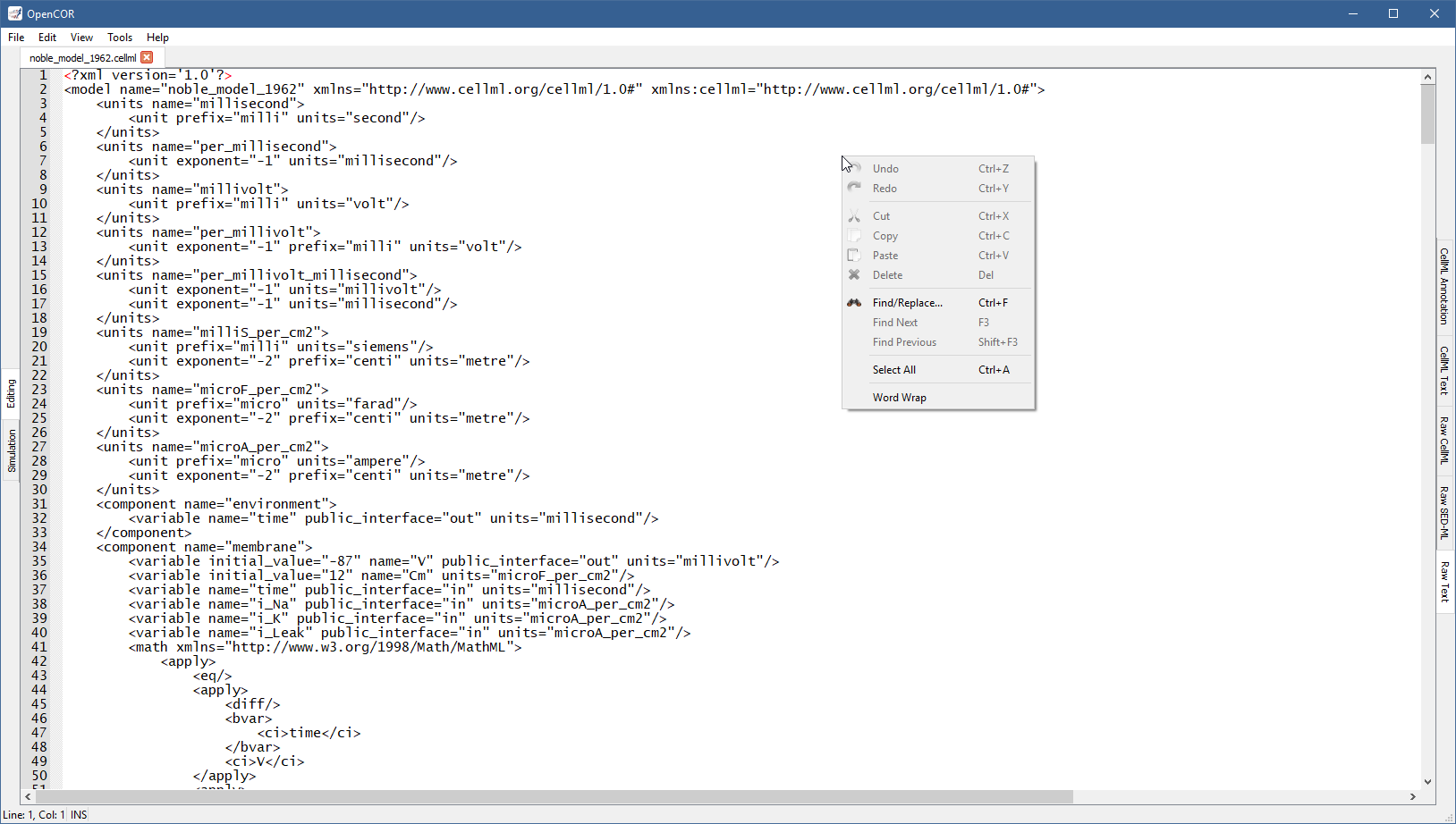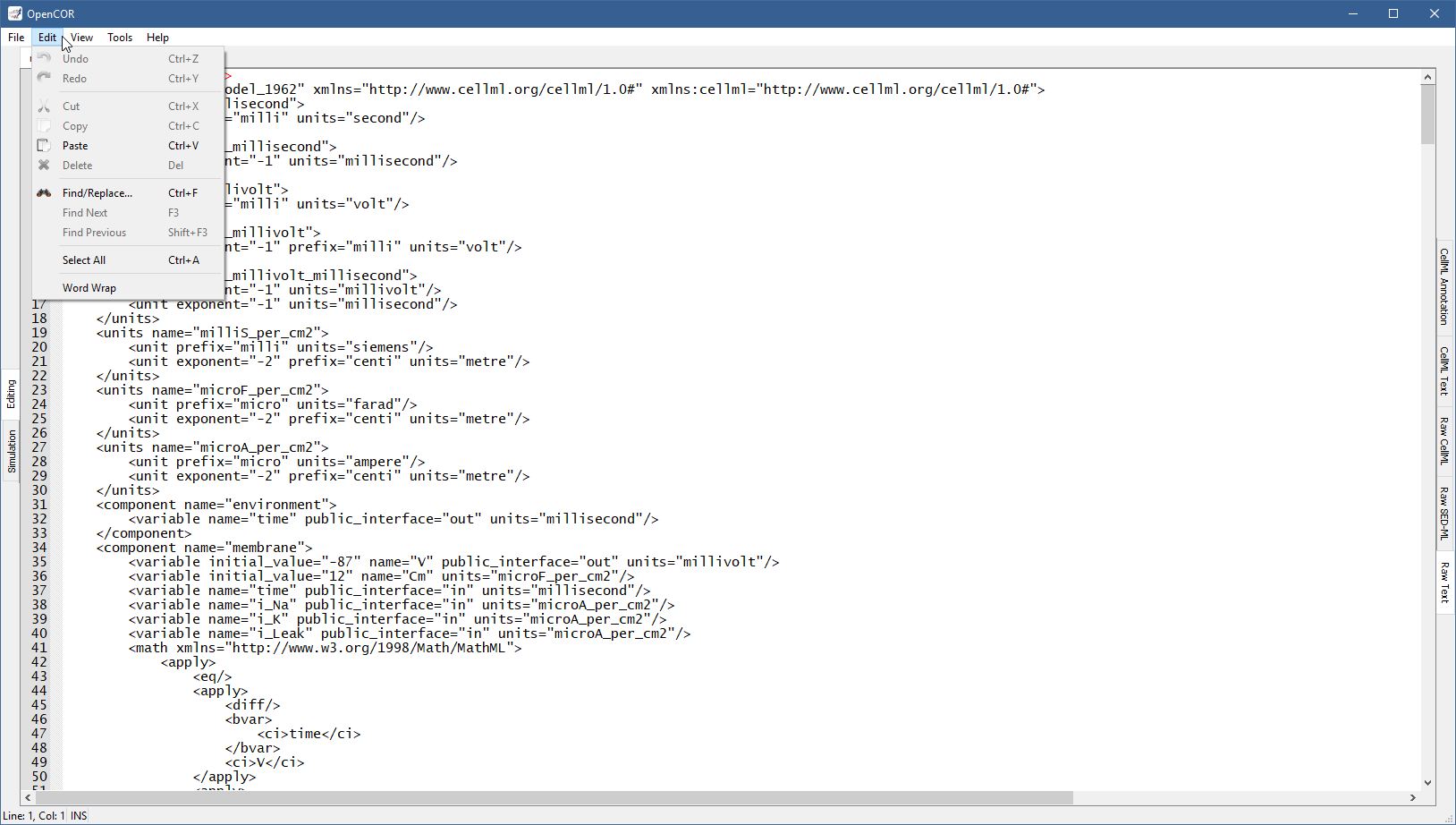 Traditional editing features can be accessed through the Edit menu, various keyboard shortcuts and the context menu of the editor: