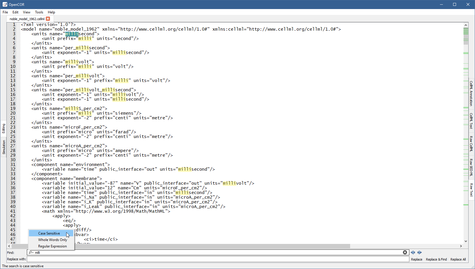 You can make the search case sensitive, look for whole words only and/or use a regular expression by selecting the requested option(s) from the drop-down menu to the left of the Find field:
