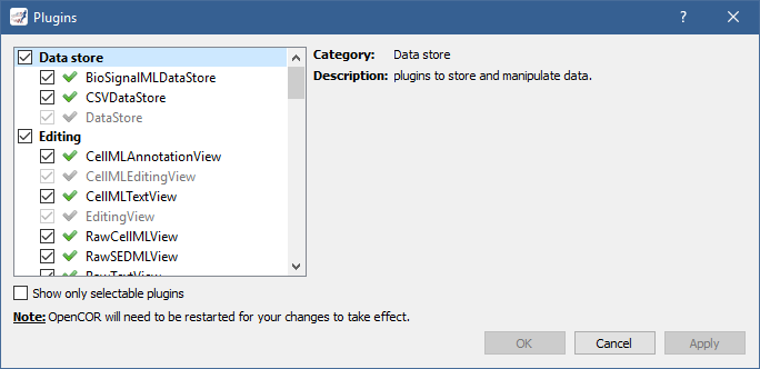 As can be seen by opening the Plugins dialog (either by selecting the Tools | Plugins... menu or by clicking here) and by unselecting Show only selectable plugins (if necessary), OpenCOR comes with different types of plugins: