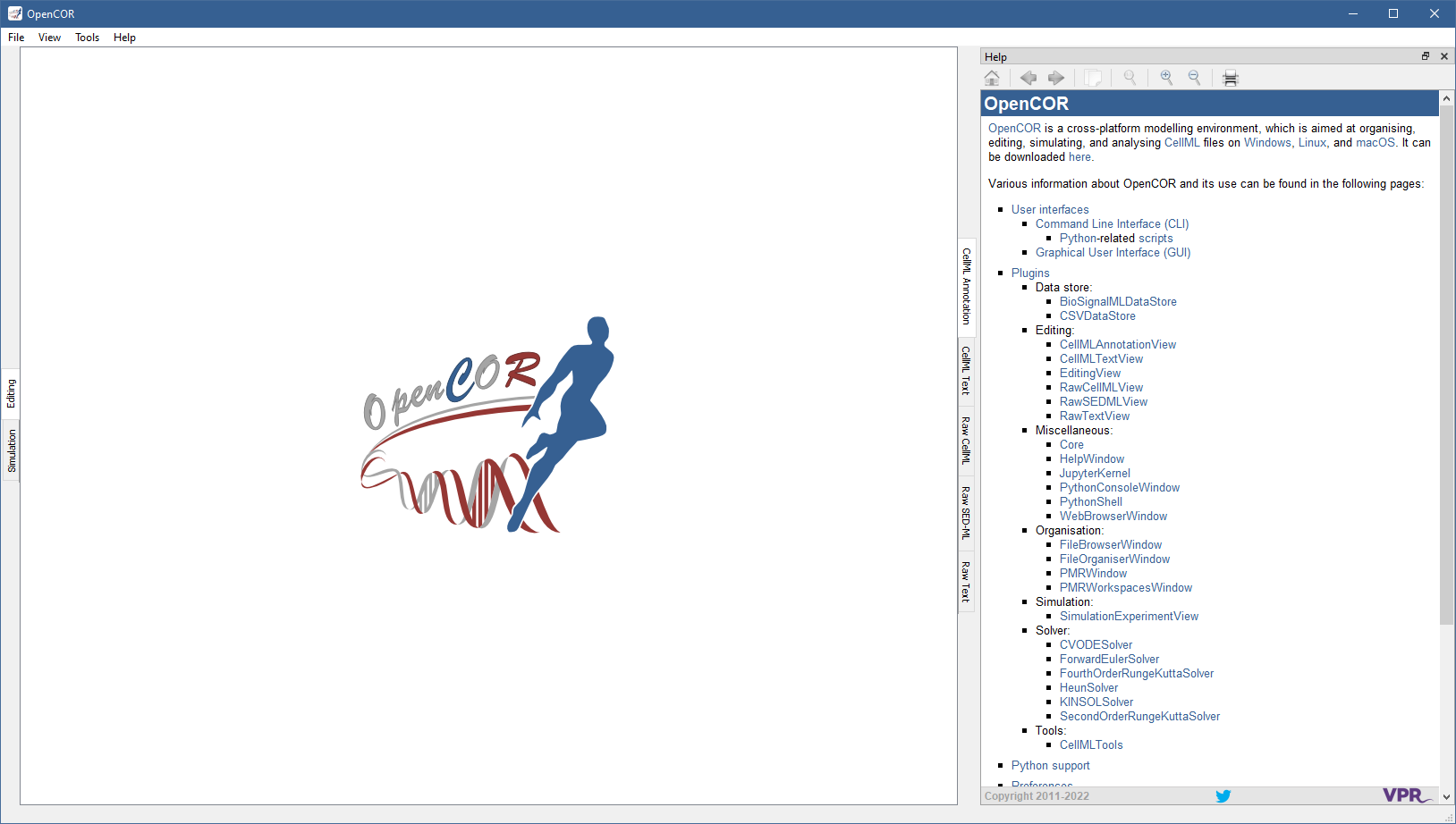 The HelpWindow plugin provides some user documentation, which contents is the same as the one available on the OpenCOR website:
