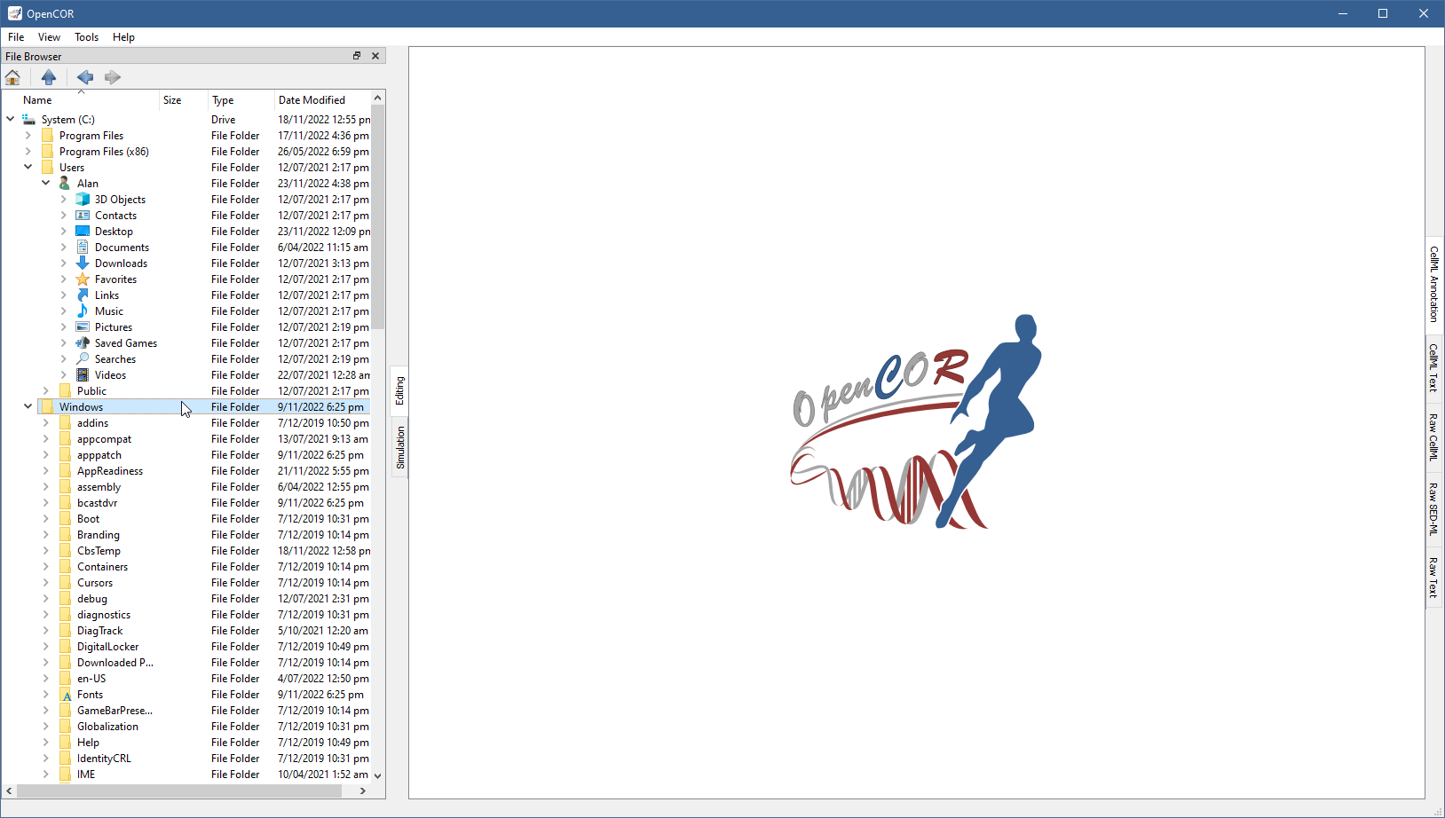 The FileBrowserWindow plugin offers a convenient way to access your (physical) files, remembering the folder or file that was selected when you last ran OpenCOR. By default, your home directory is selected:
