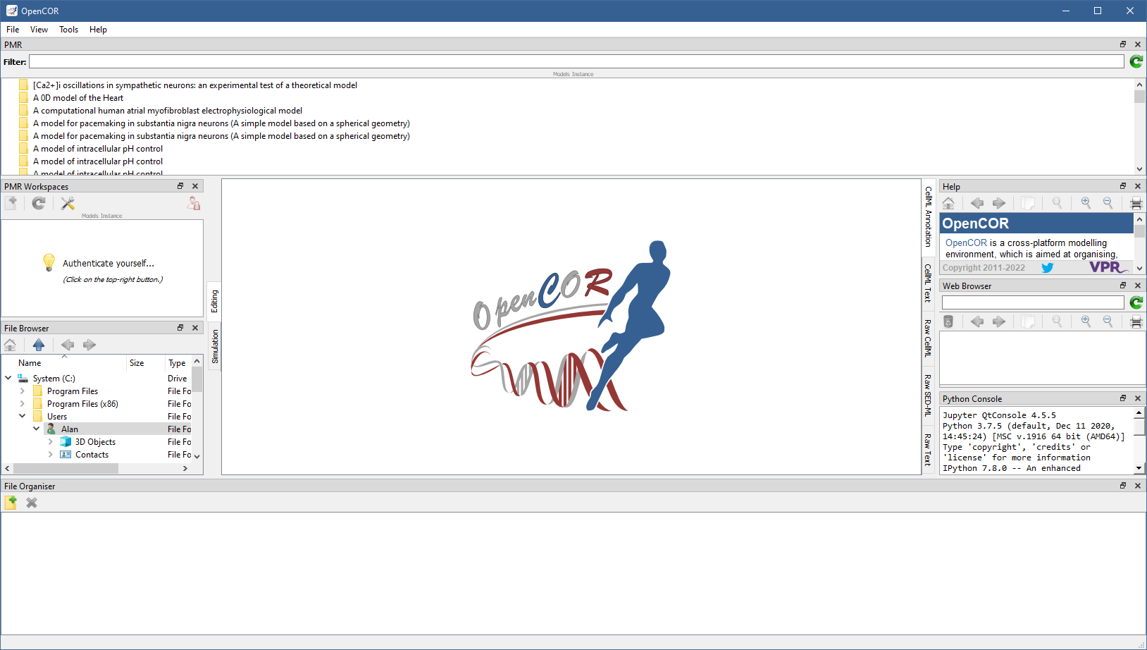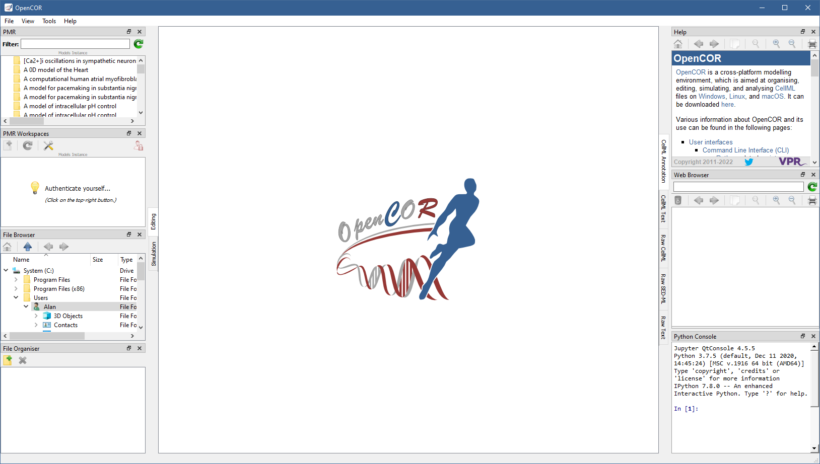 OpenCOR offers a consistent GUI across the different platforms it supports. The look and feel of the interface is determined by the plugins that are selected. The first time you run OpenCOR, it will look something like: