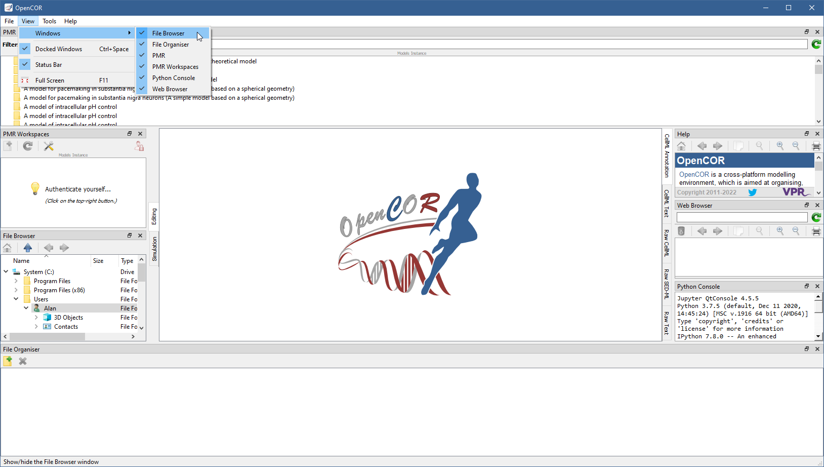 The central area is used to interact with files. By default, no files are open, hence the OpenCOR logo is shown instead. To the sides, there are dockable windows, which provide additional features. Those windows can be dragged and dropped to the top or bottom of the central area: